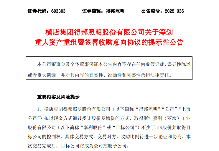 得邦照明表示,本次交易是为实现公司产业结构优化,增强盈利能力和资产质量,公司拟以现金方式通过受让股份及增资的方式取得嘉利股份的控制权。得邦照明于8月26日与嘉利股份部分股东签署《收购意向协议》,意向取得嘉利股份不少于51%股份并取得目标公司的控制权。本次交易完成后,嘉利股份将成为上市公司的控股子公司,纳入上市公司合并报表范围。