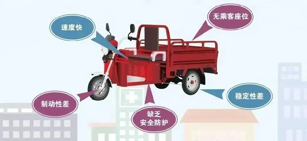 三轮车的车辆转向、制动等安全部件安全性能普遍较差,在违法载人或装载货物的情况下,由于重量增大、重心增高等方面的原因,一旦发生紧急情况,车辆难以控制。