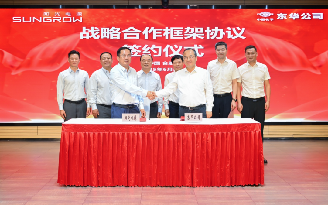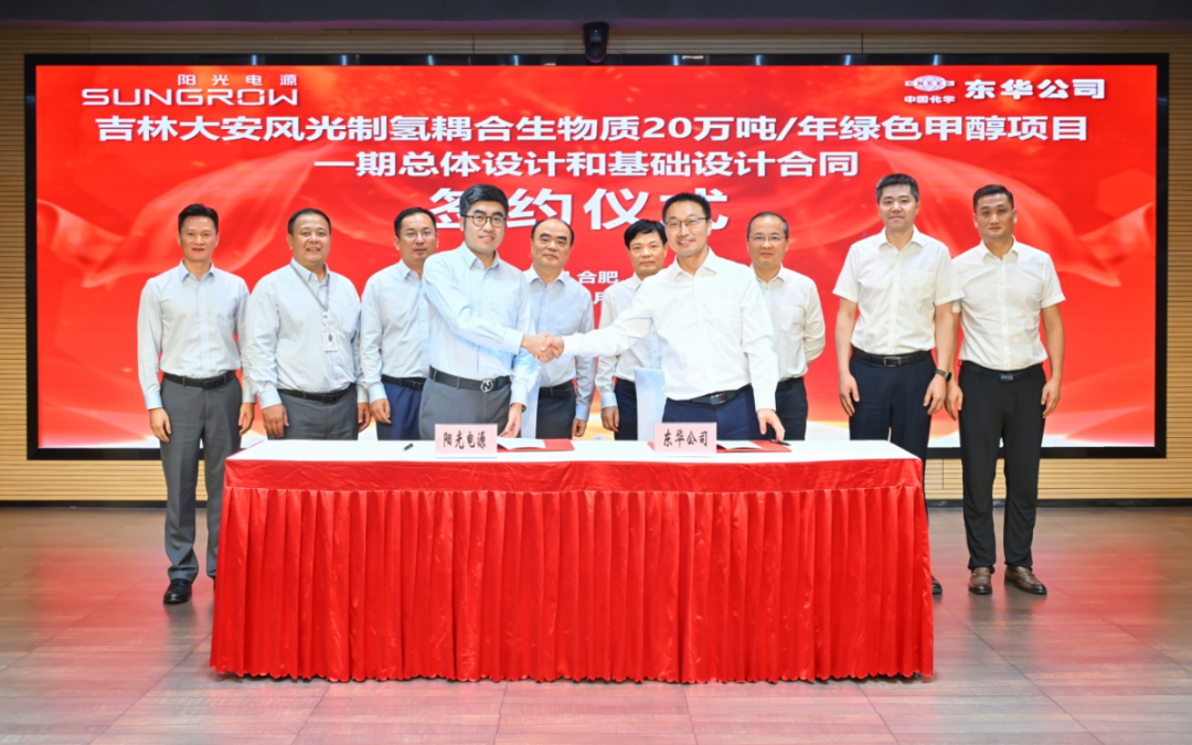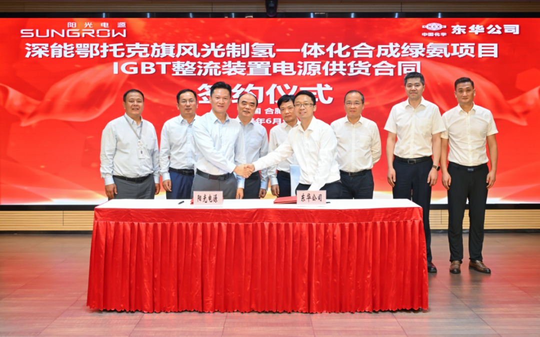 6月5日,中国化学东华公司与阳光电源签署战略合作框架协议,并就双方互为合作伙伴的绿色甲醇项目设计合同、绿氨项目IGBT整流装置电源供货合同进行了集中签约。中国化学东华公司党委书记、董事长李立新与阳光电源股份有限公司(以下简称“阳光电源”)董事长曹仁贤出席仪式见证签约,并就进一步加强多元化合作进行了深入交流。